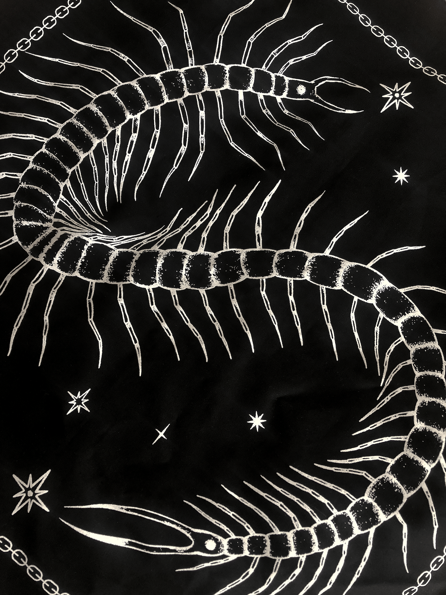 22" x 22" black cotton bandanas with a centipede design, printed locally in Seattle, WA.